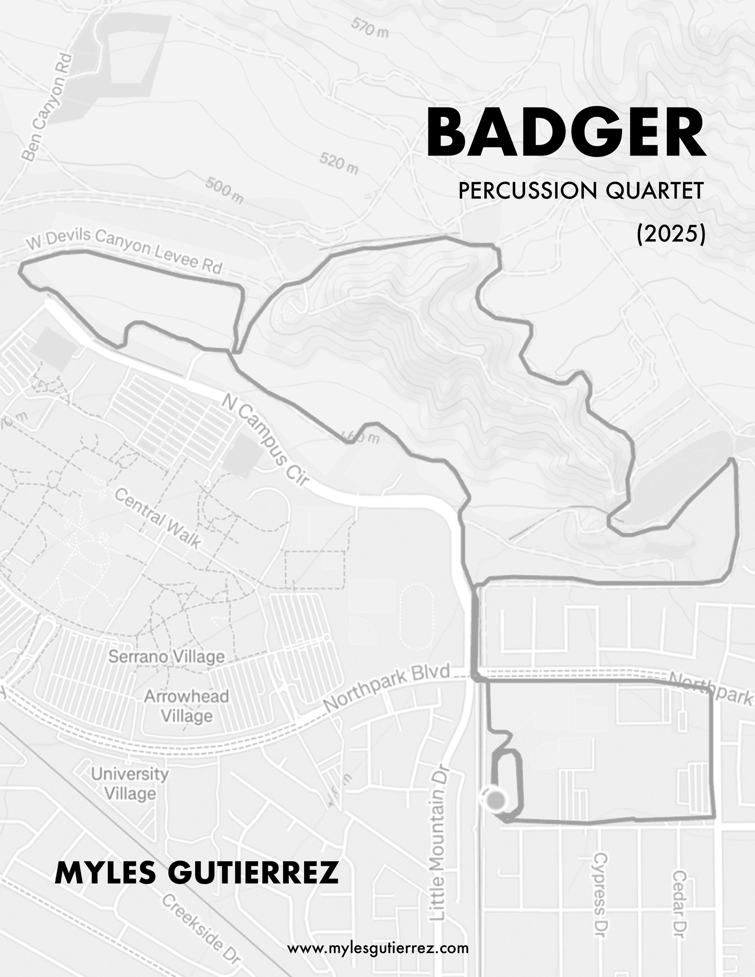 “Badger” is a percussion quartet named after Badger Hill, a trail which I would run frequently during my years on cross-country in high school. Like a run, the piece exhibits a brisk pace and several textural changes, reflecting the alterations in scenery along the trail. The chosen percussion instruments evoke the diverse sounds encountered when stepping on the terrain of Badger Hill – the crisp rustle of dirt, the firmness of asphalt, the scatter of rocks, and the resonance of wooden and metal bridges. Throughout the piece, the players become a team, running together and trading sonic textures, mirroring the rhythm and camaraderie of a cross-country run.